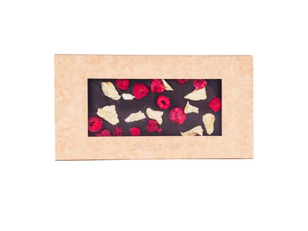 - Hořká čokoláda s malinami a ananasem: Osvěžující maliny a sladký ananas dohromady s hořkou čokoládou je kombinace, která vás potěší v každém kousku.