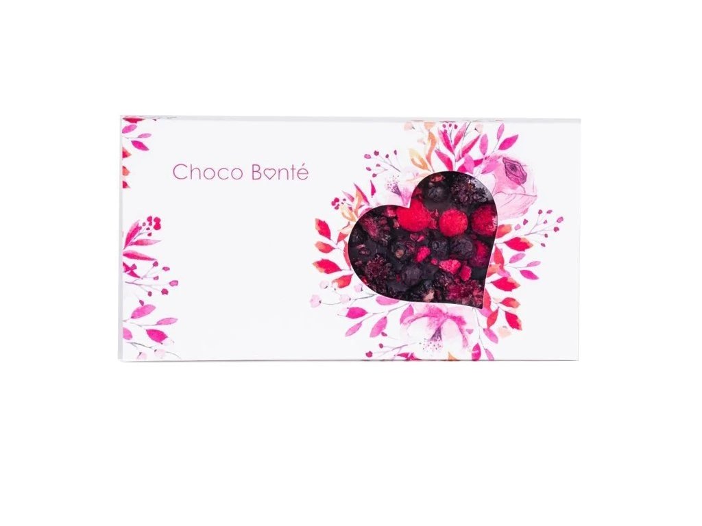 - Hořká čokoláda s lesním ovocem - srdce: Čokoláda s lyofilizovanými malinami, ostružinami a černým rybízem, zabalená v elegantní krabičce s otvorem ve tvaru srdce.